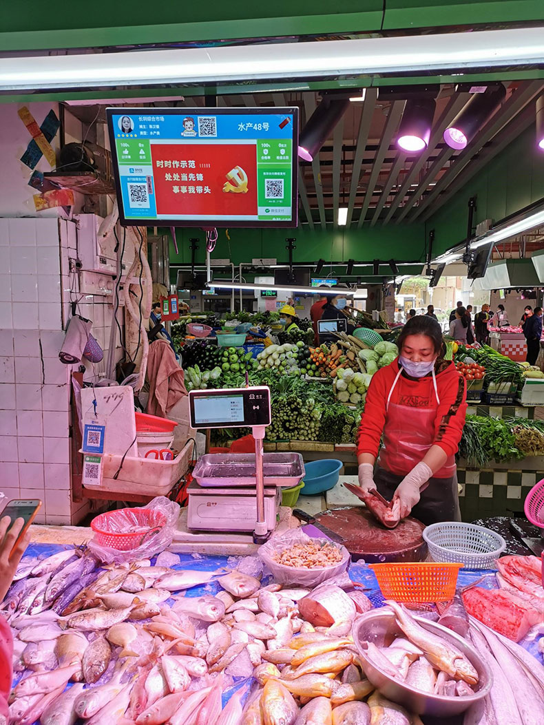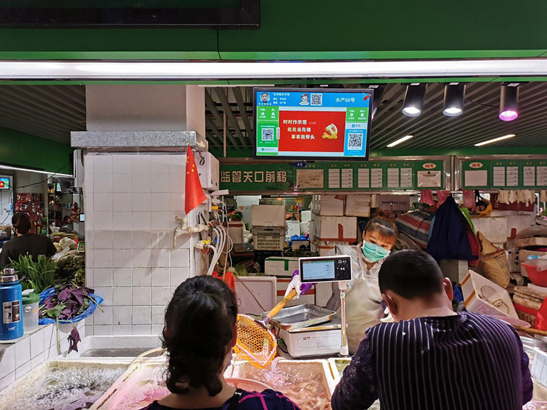 另外在每個(gè)檔口都配有21.5寸的商戶信息公示屏,有商戶的靚照信息、經(jīng)營執(zhí)照、菜品公示、市場信息,如此亮證經(jīng)營和規(guī)范操作使得售賣、購買節(jié)更加透明、準(zhǔn)確和現(xiàn)代化,真正做到讓老百姓買得放心,吃得安心。與此同時(shí),手機(jī)掃一掃商戶屏上的二維碼,還可以自動評價(jià)和點(diǎn)評此次買菜的過程經(jīng)歷。而且這項(xiàng)服務(wù)評分還將作為市場每月的星級商戶評選基準(zhǔn)。可以說,不僅能進(jìn)一步提升市場對商戶的統(tǒng)一管理效率和水平,同時(shí)也能讓商戶誠信經(jīng)營,守法經(jīng)營,注重提升自家的食品和服務(wù)質(zhì)量。