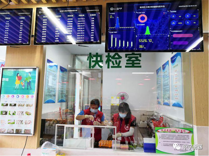 市場的肉菜快檢室為群眾提供蔬菜、蛋類、肉類等食用農(nóng)產(chǎn)品快速檢測服務(wù)