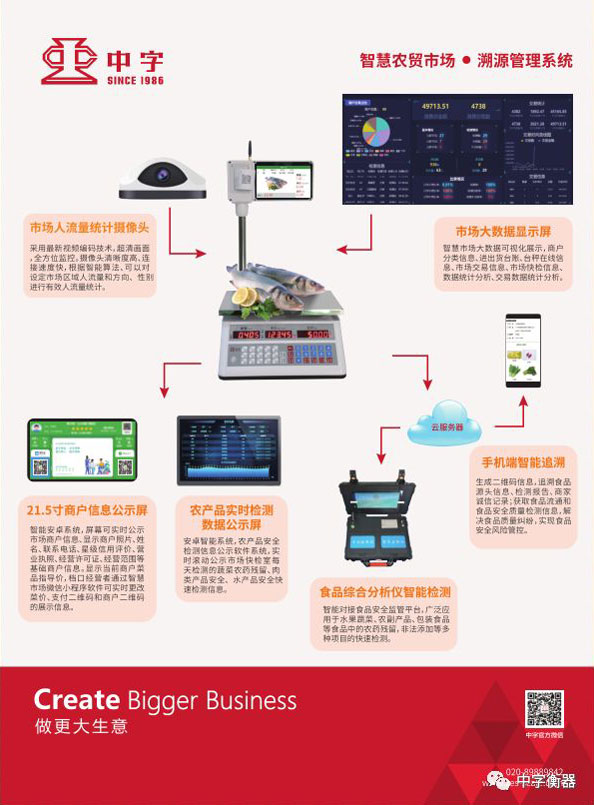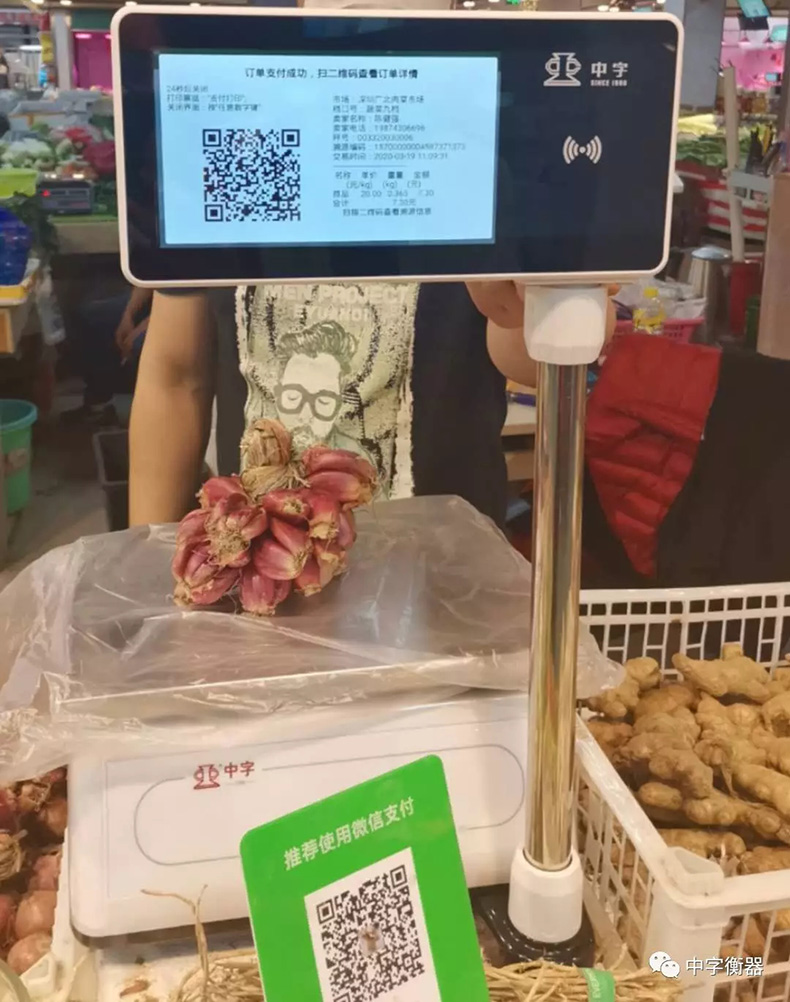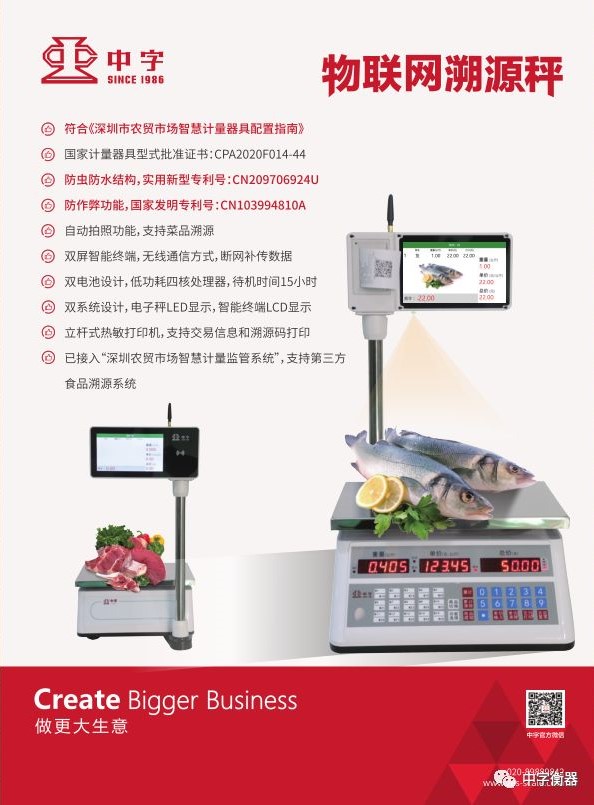 中字牌物聯網溯源秤——雙面液晶全彩顯示屏同時具有高清拍照功能,可WIFI聯網與后臺連接,在交易完成時自動上傳交易商品數據信息和圖片到后臺以及《深圳農貿市場智慧計量監(jiān)管系統(tǒng)》;并可熱敏紙打印溯源小票,通過小票上的溯源二維碼可以追溯產品購買信息、產品來源、供應鏈等信息內容。同時它具備PLU商品快捷鍵、多商品累計/累計刪除、商品單價儲存,還支持微信、支付寶等電子支付以及會員積分、刷卡等功能。