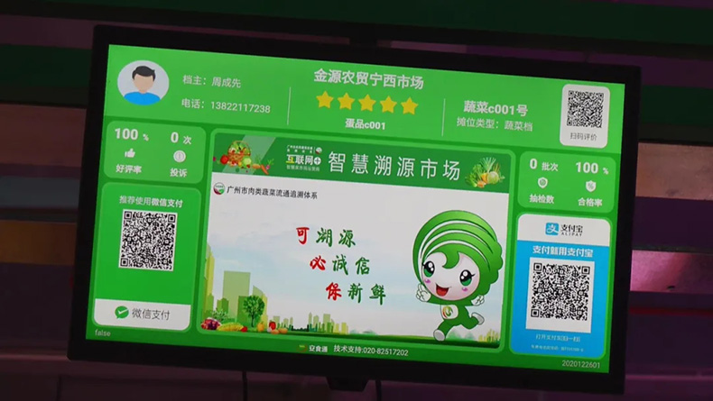 同時, 為確保市民買得放心、吃得安心,市場還新增了食品溯源系統(tǒng),運(yùn)用中字智慧市場管理系統(tǒng)提供專業(yè)化、管家式的現(xiàn)代服務(wù),涵蓋安全管理、衛(wèi)生管理、食品溯源等方面,統(tǒng)合解決移動支付、農(nóng)殘檢測、食品追溯、數(shù)據(jù)整合等問題。市場內(nèi)每個檔口都有一個智慧溯源市場系統(tǒng)的商戶信息屏,商戶營業(yè)執(zhí)照、商品參考價格、抽檢合格率等相關(guān)信息一目了然。