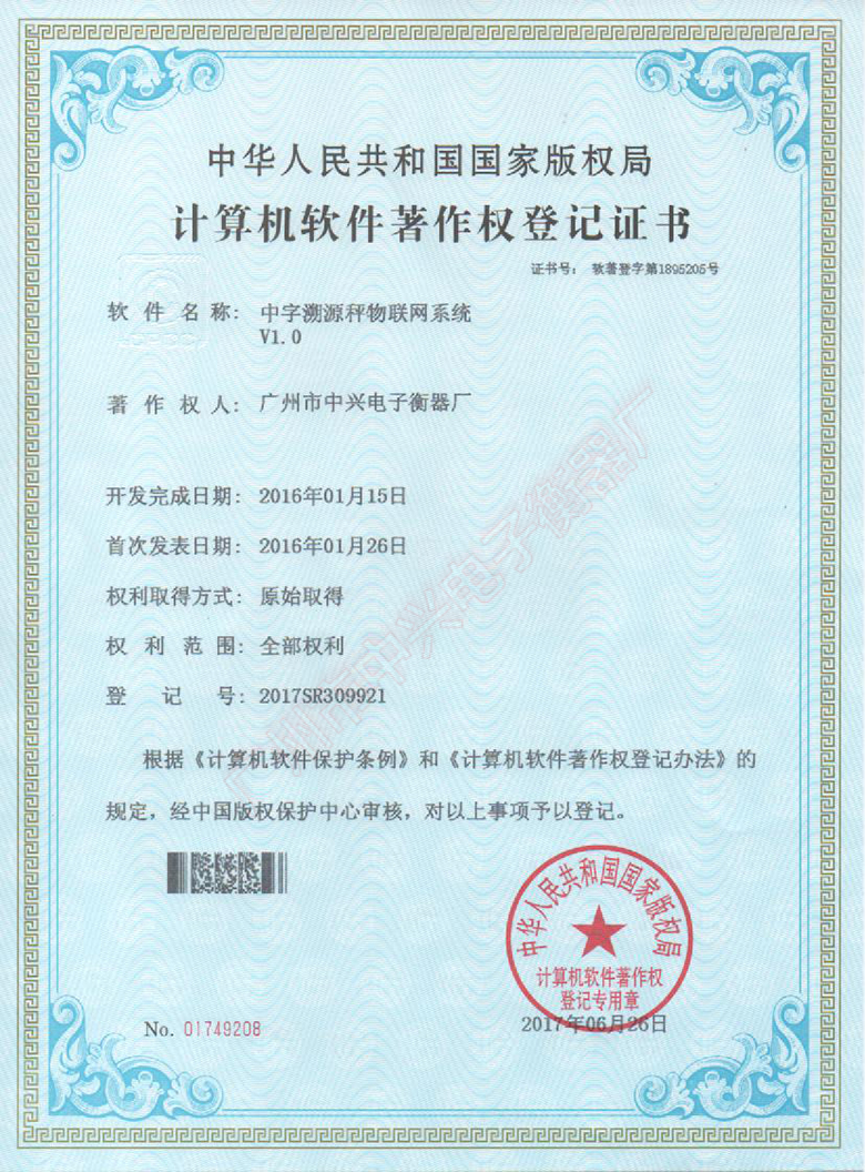 中字溯源秤物聯(lián)網(wǎng)系統(tǒng)證書