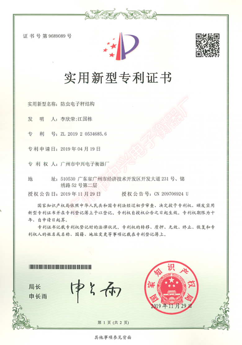 防蟲電子秤結(jié)構(gòu)專利證書