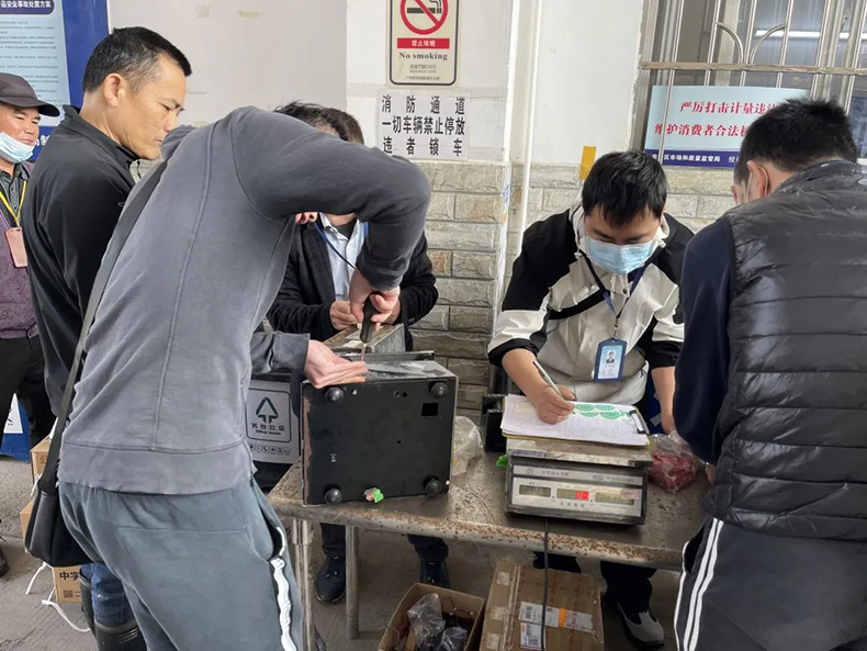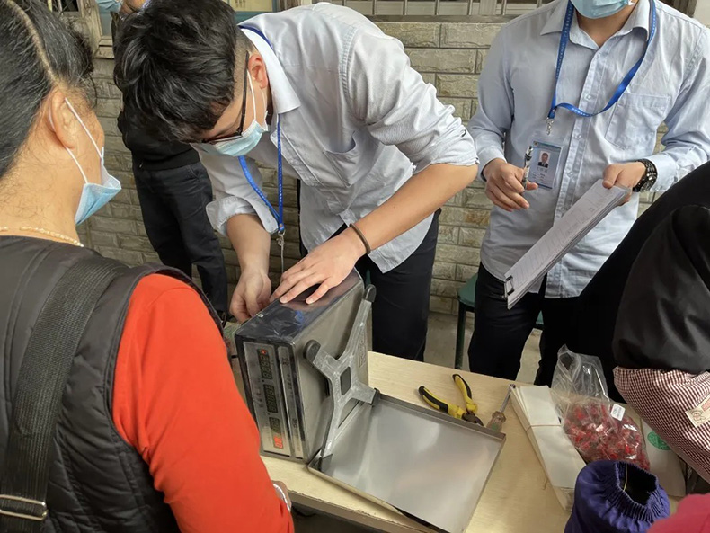 現(xiàn)場商戶都自覺有序參加本次的計(jì)量器檢查活動(dòng),工作人員認(rèn)真仔細(xì)的檢查每一臺(tái)電子秤,檢查活動(dòng)井然有序地進(jìn)行著。