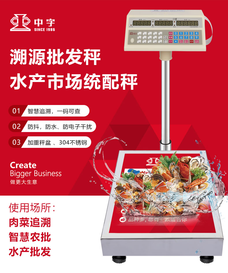 中字溯源批發(fā)秤采用了中國航天工業(yè)公司傳感器,精準(zhǔn)計量; 單價存儲、多組累計功能;WIFI無線通信傳輸數(shù)據(jù),支持?jǐn)帱c(diǎn)續(xù)傳;熱敏紙小票打印溯源二維碼;LED單/雙面顯示屏,高清實(shí)時讀數(shù); 高純度ABS工程塑料外殼,超強(qiáng)抗摔、耐熱耐冷; 鋁制秤盤底座頭,堅固耐腐蝕; 鉛酸蓄電池,持久續(xù)航、安全可靠;分離式充電/電池蓄電,使用方便;防水板防鼠管設(shè)計,壽命更持久;可調(diào)節(jié)加厚秤腳,牢固貼合、穩(wěn)定。
